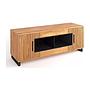 Medien-Center (lange Version) "PAULO", Wildeiche furniert. Dekorative Türen mit massiven Profilleisten und schwarz abgesetzten Schattenfugen. Moderne Slimline-Griffe. Bodenfreies Design mit stabilen Kufen-Füßen aus schwarzem Metall. SOFTCLOSE Türscharniere. Die Schubladen laufen auf Teleskopschienen mit Selbsteinzug. Schrankeinteilung: Zwei Holz-Drehtüren und eine Mediennische.