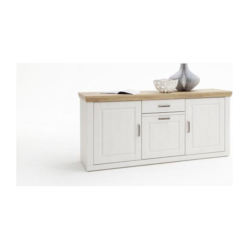Sideboard/ Dressoir/ Anrichte im beliebtem Landhausstil. Oberflächen in hellem Holzdekor mit profitierten Paneltüren. Abdeckplatte eicheartigem Holzdekor. Eine Schublade auf Teleskopschienen und drei Drehtüren mit einstellbaren Scharnieren.