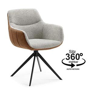 Armlehn-Stuhl "SAARBURG" mit Drehfunktion und Rückholautomatik. Stabiles Metallgestell, das jetzt auch in der neuen Lackfarbe Champagner erhältlich ist (siehe Abb.). Die rundum mit Komfortschaum gepolsterte "Sitzschale" gewährleistet einen angenehm, festelastischen Sitzkomfort. Die platzsparend integrierten Armlehnen entlasten Rücken und Schultern optimal. Ein sehr bequemes Sitzmöbel in elegantem Design. Besonders dekorativ sind die handwerklichen Steppnähte. Sehr oft verkaufen wir bei diesem Modell unsere "BICOLOR" Kombibezüge aus den atmungsaktiven Stoffen BULL und SNEAK (siehe Abb.) mit Fleckschutz bzw. wasserabweisendem Lotuseffekt. Kombibezüge, mit dezentem Farbkontrast, führen wir in vielen Farbvarianten. Bei diesem Stuhlmodell bieten wir Ihnen eine große Stoff- und Farbauswahl. Das formschöne Sitzmöbel überzeugt durch seine solide Qualität und eine aufwendige Detailverarbeitung. Durch die praktische "AUTORETURN"- Funktion (Rückstell-Mechanik) stehen Ihre Sitzmöbel stets korrekt platziert am Tisch. Das Produkt erhalten Sie fertig montiert, nicht zerlegt!